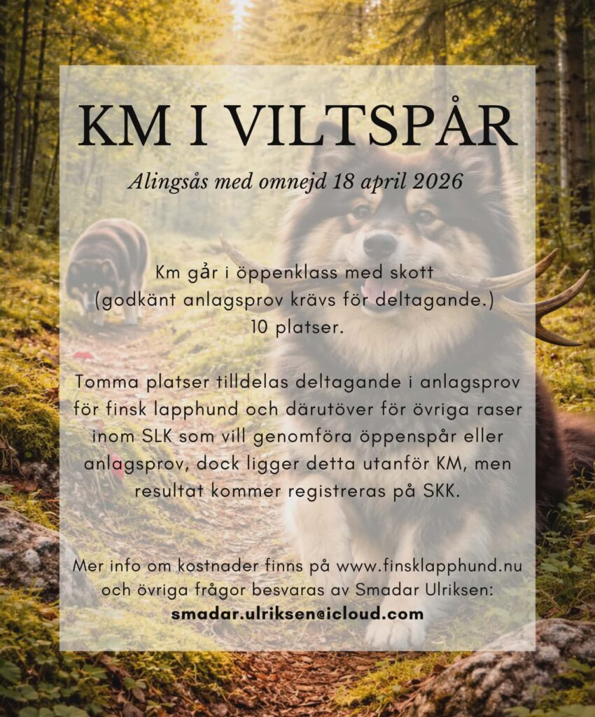 Nu har anmälan för KM i Viltspår äntligen öppat. Spåret hålls i Alingsåstrakten den 18 April 2026. KM arrangeras i öppeklass med inkluderat skott. Maximalt antal deltagare är 10st. Skulle det finnas platser kvar, kommer platser kunna användas till anlagsklass med (kommer att informeras om det finns möjlighet till detta närmare sista anmälningsdag. Skynda dig in och anmäl dig och din hund nu till öppenklass på: https://skkstart.se/events/4205